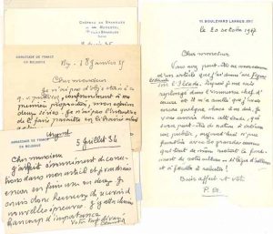Bel ensemble sur sa collaboration à la Revue de Paris. Bruxelles 5 juillet 1934. Il demande une nouvelle épreuve de son article : « J’y attacherais beaucoup d’importance »... Brangues 11 août. Il demande des exemplaires de la Revue de Paris du 14 juillet « où a paru mon article sur Richard Wagner »... Bruxelles 18 janvier 1935. Il autorise la publication de son essai [Introduction à la peinture hollandaise] « en deux séries. Je n’ai pas l’intention de le faire paraître en librairie avant q.q. temps »... Brangues 14 juin. « L’auto a fait sortir de mois les petits vers ci-contre que vous pourrez joindre, si le cœur vous en dit, à mes Poëmes (en ce cas à placer avant Le Marcheur) »... Paris 16 mai 1936. Envoi de vers : « La ponctuation paraît capricieuse. Je vous serais cependant reconnaissant de la maintenir telle quelle. Si vous étiez tout à fait gentil, vous maintiendriez la feuille de garde telle quelle. C’est comme un héraut qui soufflerait dans ma petite trompette, – faite de la tige d’un pissenlit ! »... 20 mai. « L’autre jour en attendant le train, j’ai commis une autre petite pièce qui pourrait être jointe aux autres. Dans ce cas elle devrait précéder immédiatement Œillets »... 30 octobre. « Je vous donnerai volontiers mon étude sur Verlaine. Quant au Festin de la Sagesse, c’est la propriété d’Ida Rubinstein et il faudra que je demande sa permission »... 12 avril 1937. « J’ai beaucoup aimé Laforgue (surtout ses œuvres en prose), mais je l’ai un peu oublié. D’autre part, je suis un peu souffrant, accablé de travaux, et ne puis ajouter à la somme de mes obligations »... 28 mai, envoi de son abonnement à la Revue de Paris... Brangues 13 juillet. Il n’a rien dans ses tiroirs, « sauf des mysticités exégétiques qui feraient probablement dresser les cheveux à vos lecteurs », mais il le félicite sur la tenue de la Revue : « Vos articles sur Léon Blum féroces et élégants ont fait la joie de tous ! »... Paris 23 décembre 1939. Prière de renvoyer les photos pour l’illustration de ses articles Le Prado à Genève... 5 mai 1945 : envoyant son abonnement, il souhaite un « brillant avenir à l’enfant ressuscité »... Brangues 4 décembre : « Je suis content que mes Études Bibliques n’aient pas effarouché vos lecteurs. Je vous en enverrai d’autres »... Paris 20 octobre 1947. Après avoir donné un article au Figaro sur l’Iliade, il s’est « replongé dans l’immense chef-d’œuvre », et envoie une nouvelle étude, « peut-être de nature à intéresser un public, aujourd’hui si peu familier avec les grandes œuvres qui tout de même restent le fondement de notre culture – si léger d’ailleurs et si facile à rebuter ! »... 11 avril 1951. « Rien à changer au “chapeau proposé” »... [Brangues 2 août]. Invitation à Brangues : « je vous montrerais mes paperasses bibliques »... On joint l’épreuve corrigée de Fulgens Corona, corrigée par Claudel dans les semaines précédant sa mort (1er février 1955, 13 pages in-8 sous chemise autographe).