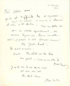 Paris 23 octobre 1921, à Henri Duvernois : « Avez-vous du neuf ? Tout est-il pour le mieux ? »… Monte-Carlo 30 mars 1924. Une maladie et un deuil très graves l’empêchent d’écrire, mais il promet sa collaboration. « Il faut vraiment que je ne puisse pas écrire pour reculer devant un article sur Roger de La F. [La Fresnaye] peintre et ami précieux »… 6 novembre 1924, à un ami : « je propose le titre français conservé The “Grand-Ecart”. Ce serait le mieux. Sinon The Child in the box me plaît – (avec en sous-titre “Le Grand Écart”) »… Londres 1924. « Des coups du sort assez durs m’ont fait tomber la plume des mains – peut-être pour longtemps. Je ne veux pas donner de fausses raisons. Si je me retrouve, je vous ferai signe »… Jour de Noël [1924 ?]. « Vous savez, en somme, je n’écris plus : je casse des choses, je les recolle, je me tombe sur tous les pièges d’où j’essaye de sortir en y laissant une patte, je ne fais plus rien de “présentable” à un public bien élevé »…