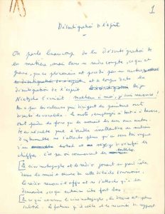 COCTEAU (Jean). Manuscrit autographe signé, Désintégration de l’esprit, [1948] ; 7 pages et demie in-4 avec ratures et corrections au dos de papier à en-tête Maison du Bailli, Milly (traces de rouille d’un trombone).