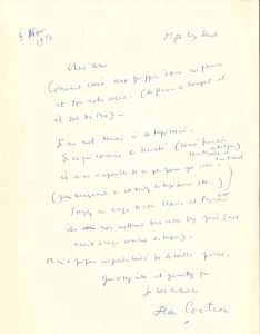 Saint-Jean Cap Ferrat 5 novembre 1952, [à Marie Cuttoli] : « Je me mets demain à la tapisserie. […] Soyez un ange de voir Claude et Peyraud ils nous mettent tout cela sur pied (not exact en ce qui concerne les tapis) »… Paris 22 octobre 1961, à Jean-Jacques Pauvert : « Voulez-vous soit passer un de ces matins à midi – soit me téléphoner à la même heure. Nous prendrions alors rendez-vous »… Paris 17 avril 1962, à Pierre Franck : « Françoise Christophe est le vrai motif de mon acceptation d’une télé de l’Aigle. J’ai supprimé la tournée Baret pour elle et je préférerais l’attendre (car elle est un peu faible) que de mettre les choses en train avec une autre actrice »… Saint-Jean Cap Ferrat 10 août 1962, à Marie Cuttoli. Son silence est motivé par la santé de Francine [Weisweiler], qu’il n’ose trop laisser seule. « C’est la “fuite dans la maladie” dont parle Freud et sa fatigue l’oblige à s’y enfoncer, à refuser la lutte »…