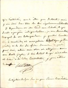 Elle le prie de lui envoyer une lettre de crédit de 1200 francs. « Mes camarades de la République ayant jugé à propos de rouvrir leur théâtre (bien que je n’aie aucun engagement avec eux ; et que celui qui me liait avec Sageret, me garantisse un congé de 45 jours à ma disposition) viennent de me faire intimer l’ordre de retourner de suite à Paris, il ne m’est pas assez facile de me passer de 18 ou 20 000ll que devait me procurer ma tournée, pour que j’obéïsse aveuglément. J’ai fait toutes mes réclamations, mais en m’empêchant de jouer ils me feraient mourir de faim »... On joint une L.A.S. de l’acteur Jean-Baptiste Grand-Ménil, 12 frimaire XIV (3 décembre 1805), à l’avoué De Cormeille, avant une réunion de ses camarades à laquelle il ne peut assister.