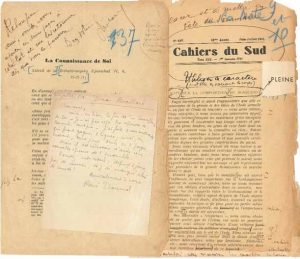 Relatives à un numéro de Cahiers du Sud consacré à l’Inde (n° 236, juin-juillet 1941). « Voici, en hâte, la fin de La Connaissance de Soi. Je n’ai pas reçu les réponses de Baruch : tant pis. J’ai fait 2 remaniements qui feront gagner 2 lignes ; ainsi, en tassant, tout peut tenir en 2 pages. Mais il est nécessaire d’avoir une nouvelle épreuve de l’ensemble »… épreuve de La Connaissance de soi, extrait de la Brihadâranyaka Upanishad, traduit par Daumal, avec corrections typographiques et quelques modifications du texte : « impassible » est remplacé par « hors de trouble », et « cela n’est que maladie de discours », dernier vers de la pièce, par « c’est affaiblissement de parole ». On joint un ensemble d’épreuves corrigées, en partie par Jean Ballard, Jean Herbert et un collaborateur, pour le même numéro des Cahiers : contributions de Shrî Aurobindo, A. K. Banerji, L. Barbillion, Willy Baruch, Benjamin Fondane, Gandhi, Jean Grenier, Jean Herbert, Jacques Masui, S. Pavitrananda, Lizelle Reymond, A. Roy, Satyanarayana, H. Sauvageot, S. Siddheswarananda, Tagore, etc. ; plus un numéro de Cahiers du Sud en partie consacré à Daumal (n° 322, 1954).