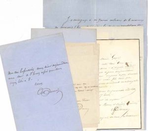 Il prie Alexandre Buchon d’apporter et de lui faire remettre Ramon de Mantanio... Il promet à Ladvocat de fournir une nouvelle pour le 4 : « Vos plaintes me touchent l’âme »... Assurance à une dame qu’il est heureux « d’avoir été pour quelque chose » dans le prolongement de congé de son mari... Mot à Harmand au sujet de La Flibuste et d’Olympe de Clèves... Explications à Berryer sur sa rémunération... Invitations à dîner à Guyet, à Lafontaine... Le 23 décembre 1868, il s’engage à ne pas exiger, si le manuscrit ne convient pas, la mise en répétition de son drame des Prussiens sur le Rhin (1868). Etc.