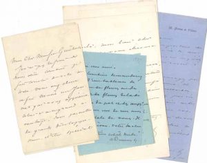 Au critique dramatique Camille Guinhut : très touché par son article, il le félicite d’avoir trouvé un journal qui l’apprécie, et qui a l’avantage « d’être spécial et de vous créer une autorité dans le monde dramatique » [23 juin 1870]… Il ne saurait recommander Guinhut comme critique dramatique, au Constitutionnel : « Je ne connais même pas les rédacteurs »… Au peintre Antoine Vollon : « Je pars dans les premiers jours de juin. […] venez manger la soupe ou le café au lait du matin » [4 mai 1887]… « Combien demanderiez-vous d’un tableau de fruits ou de fleurs ou de fruits et de fleurs de la dimension du pot et des œufs ? C’est pour un de mes amis qui raffole de vous. […] Votre tableau de l’Exposition est-il vendu ? » [1887]… Remerciement pour son « ravissant bouquet. […] J’avais une raison de tenir à ce petit cadre, j’en ai deux maintenant » [novembre 1888]… « Je suis pris par la répétition du Demi-Monde et demain aussi » [29 mars 1890]… « Exquis ce tableau de la galiotte, mon cher ami. Je ne sais pas pourquoi je me figure que c’est ce tableau-là que vous aviez fait pour moi à Marseille et que vous avez mieux aimé donner à un autre, gredin ! »… Il reçoit une lettre de Mme Cassin « qui vous donne carte blanche et qui est enchantée de votre esprit comme de votre talent »… « J’ai lu aux Français. Grand succès de lecture. Vous m’avez vu aussi bien découragé et bien fatigué. Faites comme moi – obstinez-vous »… à Auber, pour envoyer à Mme Jules Sandeau un coupon de loge… à Mme Fauvel : explication de sa décision de se séparer de Gabrielle Dugué, « excellente cuisinière », « très exacte, très propre et très douce », qui tenait bien ses comptes : il eut « l’imprudente bonté » de lui permettre d’amener son jeune fils « qui ne faisait rien et qui se trouvait un peu trop dans les chambres »… à Ernest-Ange Duez : « Vous êtes un grand coquet. Le dessin est charmant »… Rendez-vous et remerciements, d’autres lettres à Vollon, une dame, un apothicaire (commande d’herbes, de pommade et de poudre suivant une ordonnance)…