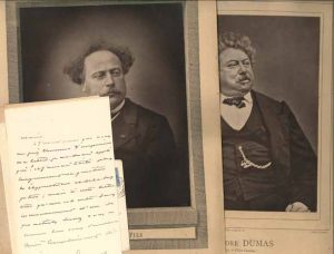 Au sujet d’une expérience sur le magnétisme avec l’illusionniste Stuart Cumberland (1857-1922). 15 décembre 1886. Contrairement à ce que dit Cumberland, « l’expérience qu’il a faite avec moi n’a pas réussi. Aucune expérience de ce genre ne réussira ni avec moi ni avec qui que ce soit n’ayant ni la crédulité ni l’impressionnabilité nécessaires. Quand le volume de la Dame aux Camélias a été découvert par M. Cumberland pendant la seconde épreuve, c’est moi, bien entendu qui me suis fait conduire le plus adroitement possible de ce côté-là. J’ai beaucoup étudié les phénomènes indiscutables du magnétisme et de la suggestion qui le remplace ou l’appuie à cette heure, je n’ai encore rien vu de concluant, sauf avec les femmes hystériques ; mais il y a là un état particulier, auquel j’échappe encore plus par nature que par volonté, quoi qu’en dise M. Cumberland »... 21 décembre 1886 : « Si j’avais pensé que vous me feriez l’honneur d’imprimer ma lettre, je me serais appliqué ! et j’aurais traité plus longuement la question de l’hypnotisme et de la suggestion ; mais si cette lettre telle qu’elle est entre dans le mouvement d’un de vos articles, servez vous en comme bon vous semblera »... On joint les portraits photographiques de Dumas père et Dumas fils par Carjat et Goupil dans la Galerie contemporaine (et une l.a.s. par J. Dumas à Joseph Garnier, 1844).
