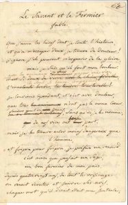 Manuscrit avec ratures et corrections de cette pièce recueillie dans Fables de M. de Florian (P. Didot aîné, 1792), livre IV, fable première. Ce joli poème célèbre le fermier sans instruction, rendu sage par l’observation de la nature. « Que j’aime les héros dont je conte l’histoire,// Et qu’à m’occuper d’eux je trouve de douceur !// J’ignore s’ils pouront m’acquerir de la gloire,// Mais je sais qu’ils font mon bonheur »… Les vers 5 et 6 ont été biffés et remplacés par une nouvelle version ; d’autres vers ont été corrigés.