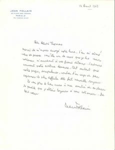 FOLLAIN (Jean). (1903-1971). 5 L.A.S., Paris 1958-1970 et s.d., à Henri Thomas ; 7 pages formats divers, la plupart à son en-tête.