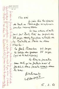 GIONO (Jean). (1895-1970). 5 L.A.S., Manosque 1961 et s.d., [à Marcel Thiébaut, directeur de la Revue de Paris] ; 5 pages et demie in-4 ou in-8, une à son en-tête.