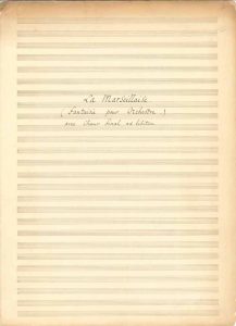 Fantaisie pour orchestre sur le thème de la Marseillaise [GC 537]. L’orchestre comprend flûtes, petite flûte, hautbois, clarinettes, bassons, cors en fa et en ut, trompettes chromatiques, 3 trombones, bass-tuba, timbales, cymbales et grosse caisse, 1ers et 2ds violons, altos, violoncelles, contrebasses ; la partie de chœurs (ténors et basses) n’a pas été écrite ; l’orchestration est restée inachevée : à partir de la page 15, Gounod n’a noté que les parties de cordes, avec quelques mesures d’intervention du grand orchestre page 20, puis la seule partie de 1er violon (p. 21-25) puis les seules trompettes (p. 25 jusqu’à la fin). Le manuscrit est soigneusement noté à l’encre brune sur papier à 26 lignes. Ce n’est qu’en 1879 que la Marseillaise va redevenir l’hymne national. Gérard Condé date cette Fantaisie sur la Marseillaise de « 1880 ? », mais l’existence de la copie jointe portant le cachet de Georgina Weldon impose une datation antérieure, entre 1871 et 1874, à Londres, peut-être en vue d’un des concerts que Gounod donnera à partir de 1872 à l’Albert Hall. L’œuvre a été publiée par Symétrie en 2009. On joint la copie manuscrite de cette partition (28 pages in-fol., taches et mouillures aux premiers ff), chaque feuillet portant le cachet encre de Georgina Weldon : Georgina Weldon for the Orphanage. [Gounod était tombé sous le charme de la cantatrice anglaise Georgina Weldon, et resta sous sa coupe plus de trois années en Angleterre, de 181 à 1874, pour, dira-t-il, « vivre la grande erreur de ma vie » ; l’affaire se termina par un procès, Georgina ayant sequestré les manuscrits de Gounod.]