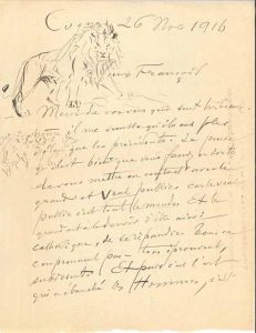 Correspondance du peintre à son ami poète illustrée de 5 dessins à la plume : un lion, un faune jouant de la lyre, un oiseau, et deux chiens dessinés à la plume et au lavis. 26 novembre 1916, le remerciant de ses vers [Le Poème de la Tranchée] : « il est bien que vous fassiez en sorte de vous mettre en contact avec le grand et Vrai public car le vrai public c’est tout le monde. Et le grand art a le devoir d’être ainsi catholique, de se répandre. Tous, ne comprennent pas. Et puis c’est l’art qui a ébauché les Hommes, c’est lui qui a le devoir de les achever »... 29 mars 1917, évoquant Victor Hugo : « cet animal gigantesque, ce diplodocus des lettres a empoisonné la France et le Monde de son génie [...] vous avez bien fait de revenir à la nette et concise Tradition française »... 16 avril 1917, attendant la paix, et dénonçant l’influence délétère de la pénétration étrangère sur le territoire français : « Je pense que vous et moi faisons de la bonne besogne en travaillant dans le sens de la concentration, de la reconstruction française. Je souffrais de la défrancisation de notre art et de notre littérature »... On joint un petit dessin à la plume (12 x 15,7 cm) représentant l’imprimeur Pierre Aubert, 23 juillet 1919 ; et une L.A.S. à Mme Porché (« Madame Simone »), Cognac 23 juillet 1919 (4 p. in-8), lettre amicale, se disant fier des artistes qui « ont plus que les autres le cœur spontanément ouvert »...