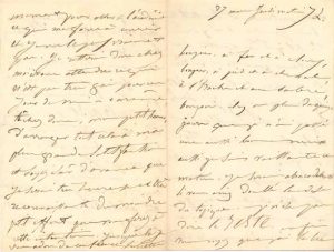 Belle lettre d’amour. « Bonjour, à fer et à cloux, bonjour, à pied et à cheval, à l’hache et au sabre, bonjour. Il y a plus de quinze jours que je n’ai passé une aussi bonne nuit aussi je suis vaillante ce matin. Je serais abracadabrante si vous aviez doublé la dose du topique… je n’ose pas dire le reste. Enfin vous voyez que j’ai le bec très matinal et surtout très bien pendu. Il n’y a rien de tel que quelques gouttes de bonheur pour vous rendre la santé et le sommeil. Si vous vouliez je serais la femme la plus gaillarde et la plus marmotte de France et de Navarre. Malheureusement vous êtes trop chiche de vos faveurs, en ce qui me concerne du moins, je ne parle pas des autres »… Il pourrait revenir chez elle ce soir, travailler auprès d’elle : « Tâchez donc, mon petit homme, d’arranger tout cela à ma plus grande satisfaction […]. Jusque-là je vous adore de confiance »… On joint un billet autographe, [vers 1875] (1 page in-16, adresse). « Bonjour bien-aimé môsieu, bonjour, que la paix et le bonheur soit avec vous et avec ceux que vous aimez. Pensez je vous prie au bon Hachette pour samedi 15 »…