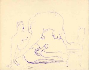 Lettre d’amour à « mon petit roi ». Il lui a écrit une lettre courte, après avoir dîné samedi chez Mme Giraudoux, puis déjeuné avec d’autres amis à Vincennes. « Tu me pardonnes de ne pas t’oublier. Les signes que je te fais d’un jour à l’autre me tiennent compagnie, en attendant de te revoir. Mais quelle joie ce matin de recevoir de toi pour la première fois quelques lignes sous lesquelles je sens battre ton cœur. Oh ! si je puis te donner, te rendre bonheur pour bonheur, comme je me féliciterai davantage encore de t’avoir entre tous remarqué. Tu as une grâce qui me touche. Cela ne se commande pas. Je voudrais passer des heures, ma tête sur ton épaule, sans rien dire. Mais je saurai bien aussi être gai, te faire quelquefois éclater de rire. Aime ma douceur, mon petit Robert. Elle est inépuisable pour toi »… On joint un dessin érotique original, à l’encre violette, de deux hommes nus en action (18,5 x 23,5 cm).