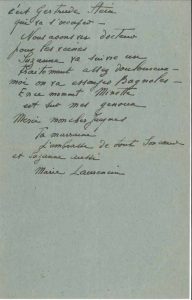 Elle a reçu son envoi [sans doute des victuailles] : « imagine notre joie. Nous n’avons eu de tout l’hiver que ce que la répartition nous donne – et pas à comparer comme qualité. […] Cette après-midi à l’atelier réunion (américains français). J’ai une amie dont le frère a été tué au dernier bombardement de Royan qui reste seule avec une ravissante et merveilleuse propriété. Elle l’a offerte aux Français pour les étudiants – ils n’ont pu l’accepter faute d’argent alors on va demander aux Américains s’ils en veulent pour les leurs. C’est Gertrude Stein qui va s’en occuper. Nous avons vu docteur pour les veines. Suzanne va suivre un traitement assez douloureux – moi on va essayer Bagnoles [Bagnoles-de-l’Orne] – En ce moment Minette est sur mes genoux »…