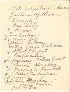 LAURENCIN (Marie). Manuscrit autographe, Liste des portraits d’hommes ; 1 page in-12.