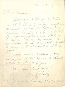 Il ne pourra pas arriver vendredi à Nancy avant 16h48, et repartira samedi à 9 h. « Je voudrais bien, cependant, jeter un coup d’œil au Musée. Pourriez-vous aviser le conservateur de ma venue et lui demander la permission de m’admettre l’heure passée ? »…