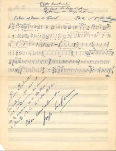 Belle page, extrait de « Chota Roustaveli, Ballet de Serge Lifar, Rythmes de Serge Lifar », avec 6 lignes de musique pour l’« Entrée et Danse de Tariel », Acte I n° 5, avec la mention : « Pour Honegger » [c’est Honegger qui a composé les actes I et IV de ce ballet, avec Alexandre Tcherepnine (acte II) et Tibor Harsanyi (III)] ; ce sont ici les rythmes marqués par Lifar sur lesquels Honegger a composé sa partition. Sous ce morceau, Lifar a écrit une amicale dédicace au critique Pierre Michaut, « qui aime et sert la danse, en souvenir de la création de ce Ballet à Monte-Carlo le 5 mai 1926 ». Au dos, 5 lignes d’esquisses au crayon.