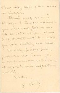 À une femme de lettres, dont il a trouvé le charmant ouvrage en rentrant du Maroc ; Miss Clara Cadiot lui a dit qui elle était, et c’est ainsi qu’il l’imaginait : « Je ne pense pas que ma lettre à Calmann-Lévy ait pu être d’un grand poids dans ses farouches décisions ; je n’ai fait d’ailleurs que lui dire très-incomplètement ce que je sentais de votre talent et de votre âme »… – Il a bien reçu la carte d’invitation de son « cher maître ami », « pour une fête du Bock Idéal, sous votre présidence », et le charge de faire passer sa carte de remerciements. Il l’invite à venir le voir à Hendaye…