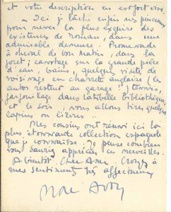 1er septembre 1930, chez la baronne Élie Lefebvre, au château de la Ménarderie dans la Sarthe : « Ici je lâche enfin mes pinceaux pour mener la plus exquise des existences de roman, dans une admirable demeure : Promenade à cheval de bon matin, dans la forêt ; canotage sur la grande pièce d’eau, bains, quelques visites au voisinage en charrette anglaise (les autos restent au garage !), tennis, gargouillages dans la très belle bibliothèque, et le soir nous allons tirer quelques lapins ou lièvres. Mes cousins ont réuni ici la plus étonnante collection espagnole »… – Les Jaces, Bellerice s/ Allier. Il lui envoie les renseignements demandés sur son Portrait de Melle L.M. « (appartient au Dr Gustave Monod). Exposé : Salon des A.P., Salon d’Automne, Salon des Tuileries. Né à Bordeaux. Nationalité française. Assurance : 10.000 ». Il aimerait aussi joindre un « Paysage de Bretagne, prix 4000 »…