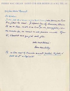 Il va déposer chez Richard Anacréon un paquet de ses livres « que vous pourrez garder, s’il ne vous encombre pas, en souvenir de notre première rencontre. Il y a là, l’essentiel de ce que j’ai voulu faire »... 20 juin 1950 : « Je suis à votre disposition (toujours un mercredi) pour que nous parlions de ce projet »... On joint des copies carbone de 4 réponses de Parinaud à Mac Orlan (juin-août 1950) au sujet de la préparation des émissions de radio.