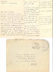 Lettre écrite comme chef du poste de guet, route de Sénéfontaine, à Beauvais. Sa commotion l’a assez démoli, les fièvres malgaches l’ont repris et il ne va pas bien : « l’on me juge digne, tout au plus, de surveiller le ciel. Métier étrange. Nous sommes sept – blessés ou auxiliaires – qui habitons les bâtiments ou le toit d’une briqueterie abandonnée. Jour et nuit, nous regardons le ciel et nous l’écoutons. Il est peu fréquenté, mais nous ne perdons pas courage »… Il décrit le paysage, hanté par des corbeaux, « animaux bizarres », et des sansonnets. « Quatre heures de garde par jour, sur un toit ou une église – et libre le reste du temps. […] En face de nous, un boqueteau (au milieu duquel on voit, maintenant que les feuilles sont tombées, un vieux pigeonnier), puis Beauvais et sa cathédrale effacée, qui ressemble à une porte »… Il demande des nouvelles de Magnin, et ajoute : « J’ai été très affligé de la mort de Lanouvelle. Quel vivant et fin esprit il était. Savez-vous des détails sur sa mort. Et nos autres amis du ministère ? – J’ai été peiné de la mort d’Alain-Fournier, que je ne connaissais pas. Mais quel splendide livre que le Grand Meaulnes »…