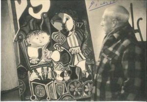 Image tirée du film de Paul Haessaerts Visite à Picasso, montrant Picasso regardant son tableau Claude et Paloma, avec signature « Picasso » au stylo bille bleu.
