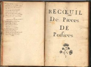 POÉSIES. Manuscrit, Recœuil de pieces de poisiees, [XVIIIe siècle] ; un volume in-8 de 299 pages, reliure de l’époque veau brun (reliure usagée, mouillures marginales et trous de vers, erreur de reliure).