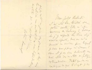 Évocation d’un séjour à Cabourg. Il a été bien touché de sa carte, qui lui est revenue de Cabourg à Évreux, et il répond de Paris par seulement un mot, « étant dans un état de fatigue extraordinaire » ; il lui envoie une note pour son beau-père, régent de la Banque. « Mon petit Robert j’ai passé un été qui vous aurait étonné, je suis allé à Cabourg où l’air m’a été assez favorable (après avoir été très très malade à Paris après votre départ pendant longtemps) et où grâce à des médicaments malheureusement néfastes j’ai pu m’habiller tous les jours, sortir tous les soirs en auto (fermé) faire de la route, aller voir (sans aucun plaisir) des églises, aller au polo, jouer – et perdre au baccara tous les soirs etc. Tout cela dans le milieu le plus commun du monde. L’hôtel fermant je suis revenu à Évreux (en auto) et y étouffant trop je suis revenu d’Évreux (toujours en auto) à Paris où j’étouffe encore davantage et où je vous quitte en m’excusant de ma fatigue de ne pas dire de plus longues tendresses à un ami tel que je ne suis pas resté un jour sans penser à lui mais la caféine me mettait dans une trépidation constante qui m’empêchait d’écrire »… Correspondance, t. VII, p. 276.