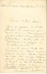 ROLLINAT (Maurice). (1846-1903). L.A.S., Fresselines, 20 avril 1887, à Gustave Geffroy ; 1 page in-8°, enveloppe.