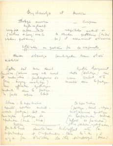 Notes où Sartre compare l’« Idéologie américaine » avec l’européenne, dans son « mythe explicatif », puis l’« Application au quotidien par des irresponsables. Abandon de l’analyse pour la synthèse. Recours à l’idée de totalité ». Du côté de l’idéologie américaine, il note : « Synthèse mal conçue dans le freudisme (schéma imagé reste causal et combinatoire : parallélogramme des forces. Langage analytique.) Mais application synthétique constante dans le pratique. La partie exprime le tout »… Du côté de l’idéologie européenne, il note : « Synthèse théoriquement établie (dialectique) mais recours constant à la causalité dans la pratique »… Il envisage ce schéma, du côté américain : « les superstructures (moralité, intentions conscientes, conduites pratiques) sont une transcription symbolique des infrastructures »… Et du côté européen : « Les superstructures (pratique, morale, religion) sont l’expression symbolique de l’infrastructure matérielle (rapports de production) police, fétichisme, mystification »…