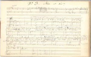 Carnet d’esquisses pour un opéra non identifié, de premier jet au crayon (une page a été repassée à l’encre), avec ratures et corrections. N°3 Scène et air (Marcelle et Smielo ?) : « Leur pitié sur la terre »… ; Scène avant l’air ; Récit [et air] ; Coda ; Air : « Ah pourquoi me soustraire aux rigueurs de mon sort »…, avec ritournelle finale ; Marche : « Ce matin sur la tourelle »… ; Couplets n° 4…