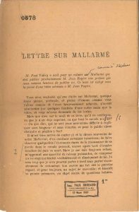 Épreuve pour la prépublication dans La Revue de Paris du 1er avril 1927, de la lettre-préface au Mallarmé de Jean Royère (S. Kra, 1927). Valéry a corrigé quelques fautes typographiques, indiqué des interlignes à insérer, et ajouté quelques mots à son texte.