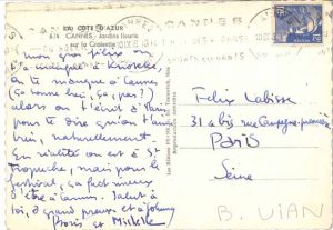 VIAN (Boris). (1920-1959). Carte postale a.s. « Boris », [Cannes 10 septembre 1949], à Félix Labisse ; au dos d’une carte postale illustrée (Cannes, la Croisette), avec adresse.