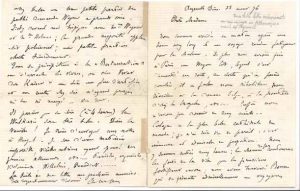 Superbe lettre sur son voyage en Allemagne et la première édition du Festival de Bayreuth. Il raconte son épuisant voyage en wagon lit, perturbé par la chaleur et les ennuis mécaniques, qui l’a empêché de dormir pendant cinq nuits… « Cologne a la plus belle cathédrale du monde ; je n’ai rien vu de pareil : c’est immense et admirable en proportions ». Ils ont traversé Bonn, longé le Rhin, admiré Coblentz, Mayence, etc… et ils ont fini par arriver à Bayreuth, « dégoutés du jambon et de la bonne bière, dont nous n’avons pu sortir depuis cinq jours »… Il décrit les paysages traversés, les superbes bateaux à vapeur du Rhin, les nombreuses troupes allemandes en exercice à la campagne, etc. « Nous venons de visiter le théâtre de Wagner […] La toile était levée et la décoration prête pour la Rheingold dont la première scène se passe au fond du Rhin. […] Il y a ici toute l’Allemagne musicale, tous les chefs d’orchestre possible, sauf la clique-Schumann, comme on l’appelle ici dans la clique Wagner. […] à chaque pas on trouve des têtes connues. Liszt est là, Stockhausen. Quant à Wagner, il a fait disposer à côté de son théâtre un immense restaurant au milieu duquel est son buste couronné de lauriers ; devant la maison qu’il habite il a également son buste en bronze avec des lauriers en bronze – c’est la théorie de l’enthousiasme prémédité »… Il donne une jolie description de la ville, « une miniature de vieille capitale de principauté allemande. […] On se croirait dans un décor d’opéra-comique », d’autant plus qu’à cause de l’arrivée de l’empereur et du roi, toutes les fenêtres sont décorées de guirlandes de sapin et de fleurs… Il reprend sa lettre le lendemain pour relater la représentation de la veille : « Hier, salle superbe. La cour ; public resplendissant de toilettes, de jolis visages ; tous les musiciens d’Allemagne, d’Angleterre, d’Italie, de Belgique ». Pour les Français : Gouzien, Weber du Temps, A. Wolff et lui-même… Le 1er tableau était « charmant, jolies voix bien posées, bien franches et bien justes » ; le 2e, toujours en récitatif ; pour le 3e : « fantastique compliqué de nuages produits par une machine à vapeur […] C’est ridicule », et toujours en récitatif ; le tableau final est encore en récitatif, sauf la fin qui devient assez belle…. « Une petite partie du public réclame Wagner à grands cris – Liszt devant moi trépigne avec Mme Wagner et Melle Holmes ; la grande majorité applaudit poliment ; une petit fraction chute timidement. […] Il parait que ce soir la Walkirie sera très belle »…