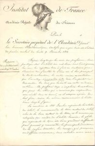 ARAGO (François). (1786-1853) physicien et astronome. P.S. comme Secrétaire perpétuel de l’Académie royale des Sciences pour les sciences mathématiques, [extrait du procès-verbal du 9 novembre 1812] ; 2 pages in-fol., vignette et en-tête...