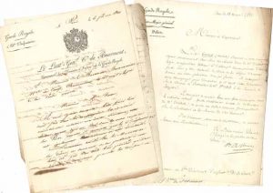 Lettres et certificats, ordres de service et ordres du jour, la plupart émanant de membres de l’état-major de la 2e division de l’infanterie de la Garde royale dont le colonel baron de Beurnonville commandait le 6e régiment. Comte Charles de Bethisy, commandant la 1re brigade (7), Louis comte de Bourmont, commandant la division (12), Aimé-Jean-François-Auguste Berger baron de Castelan, Charles-Louis-Gabriel marquis de Conflans, sous-chef de l’état-major (35), Pierre-Joseph Finot, le capitaine Heurtel, Aimery vicomte de Montesquiou-Fezensac (10), Antoine Chapt comte de Rastignac (37), Étienne-François Rochelle de Brécy, Joachim-Simon-Louis comte de Trogoff, chef de l’état-major (34), Joseph-Marie-Alexandre vicomte de Virieu (7), Angélique-Michel-Joseph-Ulrick comte de Wall... Plus qqs minutes autogr. ou a.s. de Beurnonville, qui a aussi annoté quelques-uns des envois.