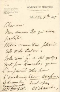 « Nous sommes 20 qui avons protesté. Victrix causa diis placuit sed victa Catoni. Votre ami G. a dit quelques mots pour démontrer que l’on pouvait voter pour l’anatomie, science accessoire. Le discours de remerciement était tout prêt »…