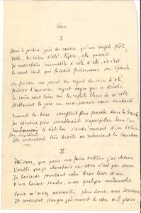 Ensemble de trois poèmes de jeunesse, chacun composé de 3 quatrains : // « Dans le jardin, près des rosiers qu’un souffle frôle, // Telle, les soirs d’été, légère, elle passait. // Je marchais, immobile à côté d’elle, et c’est Le vent seul qui faisait prisonnier son épaule »...