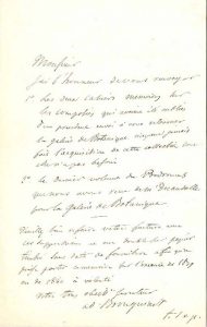 Aux libraires Treuttel et Würtz. 8-9 janvier 1841, au sujet de leur mémoire et note de fournitures « faites au Museum pour la galerie de botanique »… 17 avril, les priant d’envoyer d’urgence pour le compte de la galerie de botanique « le cahier 17 du Genera d’Endlicher, et le Prodromus regni vegetabilis de De Candolle, t. VII […] pour les expédier par occasion à un voyageur du Museum »… – Renvoi de plusieurs ouvrages, dont le Pracht-Flora d’August Corda, « que j’ai déjà fait demander en Allemagne »… [1845], à Alcide d’Orbigny. Il lui adresse M. Riocreux « qui a exécuté le dessin de fougère en arbre pour le Dictionnaire et qui n’a pas encore été payé de ce dessin »… 7 mars 1853. Renseignements biographiques sur son grand-père maternel, Charles Coquebert-Montbret, « associé libre de l’Académie des sciences position à laquelle la variété et l’étendue de ses connaissances en tout genre l’appelait de la manière la plus naturelle » : précisions sur sa carrière dans les consulats de France et dans l’administration, et ses recherches de géographie, statistique et philologie… 20 août 1860, à un collègue. Envoi de copies de botanique et prière de renvoyer une composition de chimie… On joint une l.a.s. de sa mère, veuve d’Alexandre Brongniart, à M. Ramon, sculpteur marbrier, 29 décembre [1848].