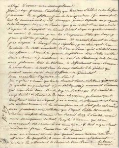 Longue et intéressante lettre sur la chouannerie. « Je suis bien satisfait, que Monsieur le Cte de Puisaye soit parvenu à organiser une réunion, et un ensemble d’opérations, en determinant Stofflet à reprendre les armes [Stofflet sera tué le 25 février] ; c’est la plus grande et la plus heureuse diversion que l’on pouvait faire en faveur de la cause ». Il craint que l’arrivée du vicomte de Pontbellanger, nommé au commandement, n’amène la désorganisation dans l’armée ; il rappelle que ce commandement lui avait été promis : « La confiance que les officiers de cette division m’avaient témoigné en me choisissant dans des temps orageux et malheureux pour leur chef de division sitôt après la mort tragique de monsieur de Boishardi en m’engageant à quitter celle du Comité central, était un témoignage trop agréable pour moy, pour que je ne me rendis à leur desir »… Il souffre cruellement de n’être pas destiné à remplir de grands emplois, et il préfère servir à pied ou à cheval, pour prouver que faire le bien a été son principal but. « Puisse la confiance accompagner celui que l’on nomera par ma destitution ! Mais jamais le roy n’aura un plus fidel sujet, puisse les succès que l’on attend de ce changement répondre à ce que l’on peut s’en promettre ! »… Il n’a reçu du conseil général que des lettres, mais ni argent ni munitions ; leurs dettes ont augmenté… Les propriétés du vicomte de Pontbellanger dans l’arrondissement de Quimper devaient naturellement lui faire désirer ce poste, mais il n’y paraissait pas destiné, « puisqu’il avait été nommé pour remplir la place de Georges, et monsieur le Cher de La Moussaye celle de commandant en second qu’occupe Mercier la Vendée, la derniere destination denote que ces messieurs ne viennent commander ici, que parce qu’on leur a opposé de la résistance dans l’armée de Vannes. Deux places de général étaient vaquantes dans les deux arrondissements de Quimper et Leon et Treguier et laissaient un vaste champ aux nominations, je n’en connois pas l’idiome, sans quoi j’y irais pour y travailler. Tout me fait un devoir de rester dans ce païs jusqu’à nouvel ordre »… Il parle encore de la correspondance avec l’Angleterre. « J’ai de plus ordonné que l’on ne pourrait prendre de lettres, qu’ouvertes et qu’elles ne parlassent n’y de politique n’y nommant personne. J’ai reçu pour essai par la voye de Deschamps 55 fusils et deux barils de poudre de 20 livres chaqu’un, je crains que de longtems nous ne soyons pas à même de fournir aux besoins des autres armées »…
