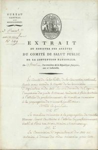 Arrêté relatif aux nouvelles « mesures républicaines » : « Art. 1er. Les machines nécessaires à la propagation des nouvelles mesures seront construites à l’attelier de perfectionnement établi à Paris rue Marc, Maison Montmorency. Art. 2°. La Commission d’agriculture et des arts est autorisée à donner des ordres nécessaires pour cette construction sur la demande de l’agence temporaire des poids et mesures »…