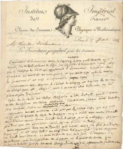 DELAMBRE (Jean-Baptiste-Joseph). (1749-1822) astronome. Manuscrit autographe, Paris 17 juillet 1814 ; 2 pages et demie in-4, en-tête Institut [Impérial rayé] de France. Classe des Sciences Physiques et Mathématiques. Le Secrétaire perpétuel...