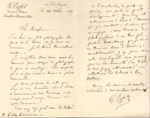 Il le remercie de sa « photographie du pied de la Tour » ; il eût aimé le voir pour « essayer de photographier la grue de montage. […] Je vous prépare la note que vous m’avez demandée sur l’état d’avancement des travaux […] Vous avez déjà parlé dans La Nature de la construction des ponts en acier qui prend un grand développement. Vous avez cité notamment le Pont de Morannes que j’ai construit ; c’est ce qui m’engage à vous adresser des photographies d’un très joli pont en bow-string que je viens de terminer dans la Drôme, à Montélimart »… On joint une l.s. de son secrétaire A. Gobert, 7 novembre 1887, renvoyant l’épreuve de l’article sur « le pont du Fust » ; une l.a.s. de son gendre Adolphe Salles, 27 avril 1888, remerciant au nom d’Eiffel pour une « bouteille en forme de tour »...