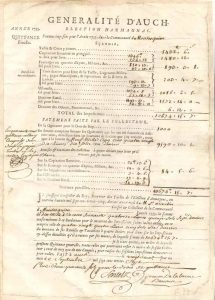 Généralité d’Auch : ordonnance impr. du Juge-Mage (1670), proclamation impr. des vicaires généraux pour un Te Deum (1688), quittance des sommes imposées dans la communauté de Montesquieu (1735), reçu de droit de franc-fief (1753), état des déclarations fournies par les engagistes en exécution de l’arrêt du Conseil du 14 janvier 1781. 6 bordereaux d’indemnité d’anciens émigrés (1825) : Baudéan-Parrabère, Dubouzet-Corné, Labay, Batz d’Aurin, Trenquelléon de Batz.