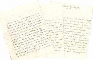 Intéressante chronique sur Napoléon, et la fête de a Saint-Napoléon. [Vers le 14 juin 1807 ?]. « L’Emp. est parti cette nuit. Les rentes sont montées aujourd’hui, l’on disait à la bourse que la raison en était de ce qu’il devait y avoir le 14 une bataille jour de l’anniversaire de celle de Marengo, qui serait aussi décisive »… Ermenonville 21 juillet 1807. L’ouverture de la session du Corps législatif l’oblige à prendre une décision : « Laisserai-je ici la maison, la ramènerai-je à Paris ? Seras-tu de retour avant la fin d’août ? – La reine restera à Morfontaine l’Emp. étant de retour tout ceci sont des questions difficiles à résoudre »… 22 juillet 1807. Il transmet une lettre de la reine. « François nous a dit qu’il était bien à Paris que le prince Joseph n’était plus roi de Naples qu’il passait au royaume d’Italie, que les françois devaient avoir évacué ce pays le 16 aoust. Je ne sais jusqu’à quel point cette nouvelle est vraie on disait qu’un exprès était venu en prévenir la reine »… 31 juillet 1807. Sa belle-sœur Françoise « prétend que l’Angleterre a accepté la médiation de la Russie et que l’ancien roi de Naples doit évacuer la Sicile, et avoir Malte en place avec le titre de roi de ce pays. Elle dit aussi que les voitures de voyage de la reine sont commandées […]. L’Emp. a été reçu à merveille il doit se rendre le 15 à Notre-Dame pour y rendre grace à Dieu de ses victoires. On dit aussi qu’il traite tout le monde à merveille »… [Peu après le 16 août 1807]. « La fête du 15 a été belle. L’Empereur accueilli à merveille, les jeux – le feu d’artifice auraient été très bien sans quelques petits accidents. D’abord Mr Forioso qui n’a pas été sur la corde tendue entre les deux ponts. Les machines pour la tendre ont cassé. Le feu d’artifice aurait été superbe si la fumée n’avait pas empeschée de le voir. Pour moi je me suis promené toute la journée en véritable badaud », etc. Il parle aussi du spectacle de l’ouverture de la session du Corps législatif, en présence de l’Impératrice, Madame, la reine de Naples, la princesse Caroline, la grande duchesse de Bade, l’Empereur, le prince Jérôme, le grand duc de Berg, etc. « Le discours de l’Emp. a été court et bien. Il a parlé de ses campagnes, a dit que sans l’amitié de l’Empereur du Nord le roi de Prusse n’existerait plus. A annoncé une diminution dans l’impôt foncier. Son intention de porte rle bien-être dans le moindre hameau, des changemens dans l’administration pour le bien du peuple. A dit qu’il avait été extrêmement touché de l’accueil qu’il avait reçu et de la conduite de la France pendant son absence »… On joint une lettre à la même d’un frère ou beau-frère, Brünn en Moravie 2 frimaire XIV (23 novembre 1805).