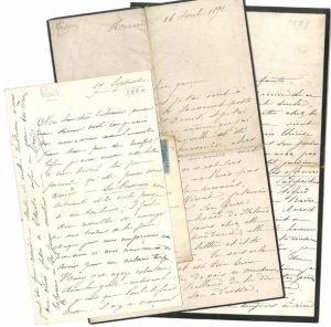 [Paris] 17 septembre [1870], à Mme Charles Cousturier, à la direction générale des Postes, à Mâcon. « Les Prussiens nous entourent et les voilà presque à nos banlieues ; il faut donc redoubler de courage […] Henry s’est engagé volontairement dans la garde nationale et je crois que Paul le fait aussi »… [Mâcon automne 1870]. « Les officiers de l’armée de la Loire s’apprêtent à donner leur vie […] Monseigneur est parti pour Tours afin d’aller demander le secours du gouvernement contre Garibaldi qui met le désordre partout à Autun mais […] le gouvernement de Tours serait bien embarrassé de faire la moindre objection aux faits et gestes du général »… Allusion au commandant qui a fait fusiller trois de ses soldats à Villefranche… [Mâcon] 26 avril 1871. Malgré une lettre rassurante de la tante Paul, « si on ferme Paris si on se fait sauter, je trouve que c’est bien le cas de partir avant, attendu que ce ne serait pas pour longtemps que tout serait bientôt fini après »…