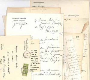 François Albert (2), général d’Andlau (officier d’ordonnance de Napoléon III), Henri du Moulin de la Barthète, Louis Barthou, Henri Baudrillart (2), Paul Bénazet, P.-A. Berryer, général Henri Bertrand, Georges Bibesco, Louis Blanc, André Blumel, Mgr Bolo, Charles de Bourmont, Aristide Briand, Henri Brisson, duc de Broglie, Robert Bruyneel, Louis Buffet, Julien Cain, Ernest Camescasse (3), César Campinchi, Louis-Mercier de Carné, prince de Caraman-Chimay, Pierre Carlier, Michel Chevalier, Jean Chiappe, Horace de Choiseul, Jean Cruppi, Simone de Lattre de Tassigny (2 belles lettres), Paul Doumer (apostille), Émile Driant, Jules Dufaure (2), Dujardin-Beaumetz, baron Louis Durrieu, Eugène Étienne (2), Armand Fallières, Alfred de Falloux, général Achille Faucheux, Jules Favre, Charles de Freycinet (2), Henri Galli, Garnier-Pagès, Émile de Girardin, Charles Giraud, général Goiran, Henri Gouraud (abîmée), contre-amiral Adolphe de Gourdon, amiral Guépratte, baron de Heeckeren, Édouard Herriot, général François Ingold, contre-amiral Benjamin Jaurès, Daniel Jordan (2), amiral Jean de Laborde, général de Lacroix (2), Anatole de La Forge (4), général Ducos de Lahitte, E. Lamy, Laurent-Pichat, André Lebon, abbé Lemire, Jean Longuet (très intéressante sur la situation troublée en Allemagne après la défaite de 1918), Émile Loubet (carte de visite), Paul Hyacinthe Loyson (photo dédicacée), Alfred Masse, Fortuné Maure, général Auguste Mercier (2), général Louis-Michel Morris, duc de Mortemart, Albert de Mun, Gustave Cunéo d’Ornano, général Philippe Pélissier, général Joseph-Alexandre Picard, Stephen Pichon, Jacques Louis Randon (2, comme gouverneur de l’Algérie), Théodore Reinach, Tony Révillon, Robin, Léon Say (2), Jules Simon (3, et photo Carjat), Pierre Stephen, Turenne Meyer, E. Wangermée (vice-gouverneur du Congo Belge), colonel Pierre Weiss, etc. On joint divers documents : un dossier sur l’aryanisation d’une entreprise juive parisienne (1941), un lot de factures anciennes, des cartes postales de la guerre 14-18, des photographies de la guerre 39-45, 4 états signalétiques et de service de soldats du 1er Régiment de Chasseurs d’Afrique (Second Empire), une carte de France historique illustrée (65 x 90 cm, 1884), une plaquette d’hommage à Rochambeau (1933), etc.