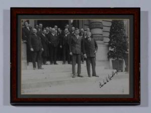 Belle photographie le représentant sur les marches de l’Hôtel de Ville de Paris, venant d’effectuer la traversée de l’Atlantique à bord de son avion Spirit of Saint Louis Il pose ici avec l’ambassadeur américain Myron T. Herrick, devant les membres de la Municipalité, à l’occasion de la réception organisée en son honneur immédiatement après son arrivée à Paris le 21 mai 1927. Il a signé la photo en bas à droite : « Charles A. Lindbergh ».