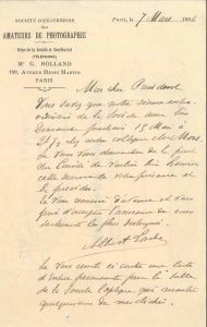 LONDE (Albert). (1858-1917) photographe et chimiste. 4 L.A.S. et 1 P.S. en partie autographe, Paris et Saint-Brieuc 1896 et s.d., [à Gaston Tissandier] ; 7 pages et demie in-8 et 1 page obl. in-12, en-têtes Société d’excursions des Amateurs de...