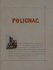 Très beau manuscrit calligraphié et richement illustré. Le manuscrit est soigneusement calligraphié à l’encre noire et rouge, dans un cadre à l’encre rouge, illustré de 36 lettrines enluminées ou culs de lampe exécutés à l’aquarelle, des armoiries peintes16 illustrations peintes à l’aquarelle en pleine page (notamment des vues du village et de la forteresse de Polignac) et 5 gravures insérées hors texte. Ce manuscrit a été commencé le 5 avril1883 et achevé le 14 juillet. Cet ouvrage d’érudition de Romain Truchard du Molin a été publié à titre posthume sous le titre Baronnies du Velay. Vicomté de Polignac, revu et complété par Augustin Chassaing (Firmin-Didot, 1892), dans un tirage limité à 30 exemplaires ; la photographie de l’auteur a été montée en frontispice du manuscrit. Le texte se compose d’un avant-propos, Polignac, et de 15 chapitres : I Origine et légende de Polignac, II Vicomtes de Polignac sous les derniers Carlovingiens. De … à 924, III Guerre de suzeraineté entre les vicomtes et les évêques. De 924 à 1188, IV Les Troubadours au château de Polignac. De 1181 à 1272, V Établissement des Polignac en Gévaudan. De 1272 à 1351, VI Guerre de succession pour la baronnie de Polignac. De 1351 à 1362, VII Les Polignac contre les routiers et les Anglais. De 1362 à 1421, VIII Avènement des Chalençon à la vicomté. 1421 à 1465, IX Deux mariages sous Louis XI. 1465 à 1510, X François Ier au château de Polignac. 1510 à 1560, XI Maison de Polignac pendant les guerres civiles. 1560 à 1596, XII Un meurtre dans la cathédrale de Mende. 1596 à 1649, XIII Les Vicomtes aux États de Languedoc. 1649 à 1691, XIV Les Vicomtes aux États de Velay. 1691 à 1715, XV Les Polignac à la Cour. 1715 à 1789. À la fin, table des matières, et table des illustrations. Ex-libris du Dr Charreyre.