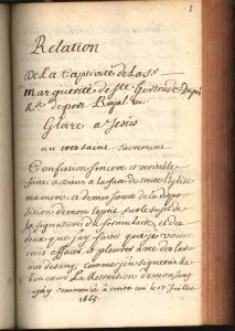 Recueil factice, de plusieurs mains, comportant notamment une Elevation a N.S.J.C. pour lui demander la grace de la priere ; des discours et oraison de Saint Ephrem ; une Conduite pour la confession et la communion ; des explications de psaumes, exercices de piété et prières ; Considerations sur la devotion à la Ste Epine de la couronne de notre seigneur qui est au monastere de Port-Royal ; une lettre du P. Grenet, supérieur de Port-Royal des Champs, à l’archevêque de Paris ; et une longue Relation de la captivité de la sr Marguerite de Ste Gertrude Dupré Rse de Port Royal », datée du 27 juillet 1665 « dans notre cellule en notre monastere de P.R. des Champs »…